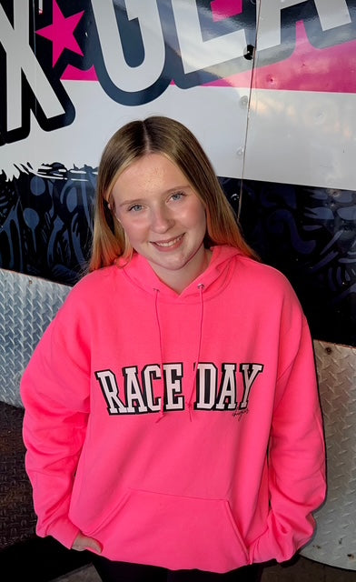 This comfy unisex Hot pink Hoodie has a classic Raceday saying.  Simple but classy.  Looks great with shorts, leggings or jeans.