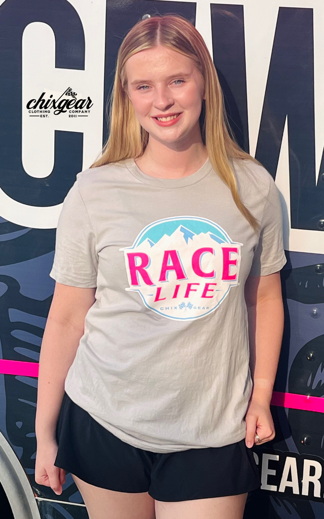 Featuring a bold "Race Life" graphic that celebrates speed, grit, and adrenaline, this tee is perfect for motorsport fans, street racers, or anyone who knows that life is best lived in the fast lane. The neutral grey color makes it an easy match with jeans, shorts, or racing gear.