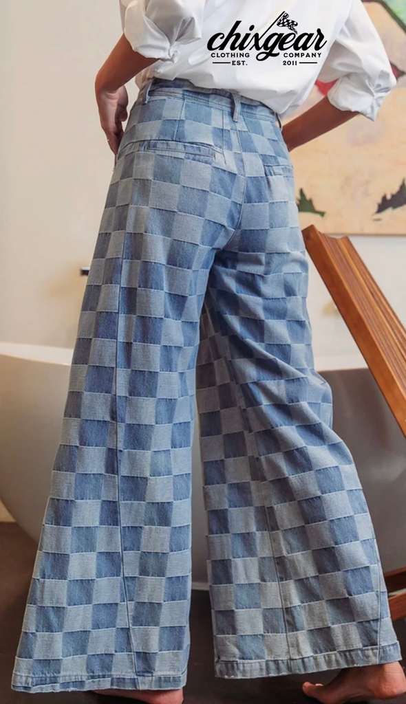 Turn heads in these bold and modern two-tone wide leg jeans. Featuring a unique contrast denim design, these jeans combine light and dark washes for an eye-catching, fashion-forward look. The high-rise waist flatters your figure, while the wide leg silhouette offers a relaxed, on-trend fit. Perfect for elevating your everyday style or adding edge to a casual night out.