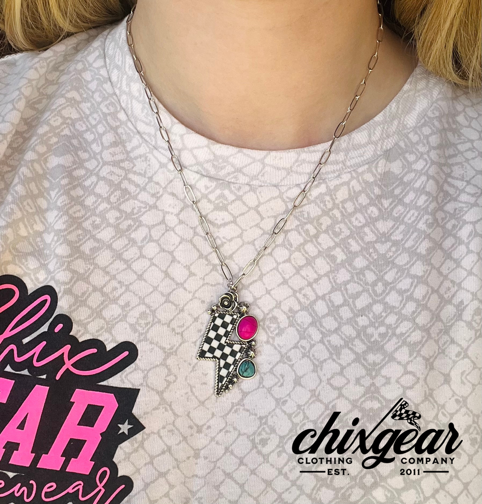 Add an electrifying edge to your look with this bold silver necklace, featuring a striking black and white checkered lightning bolt pendant. Accented with playful faux pink and turquoise stones, this piece delivers a perfect clash of punk energy and playful color. Whether layered or worn solo, it's a statement that speaks louder than words.