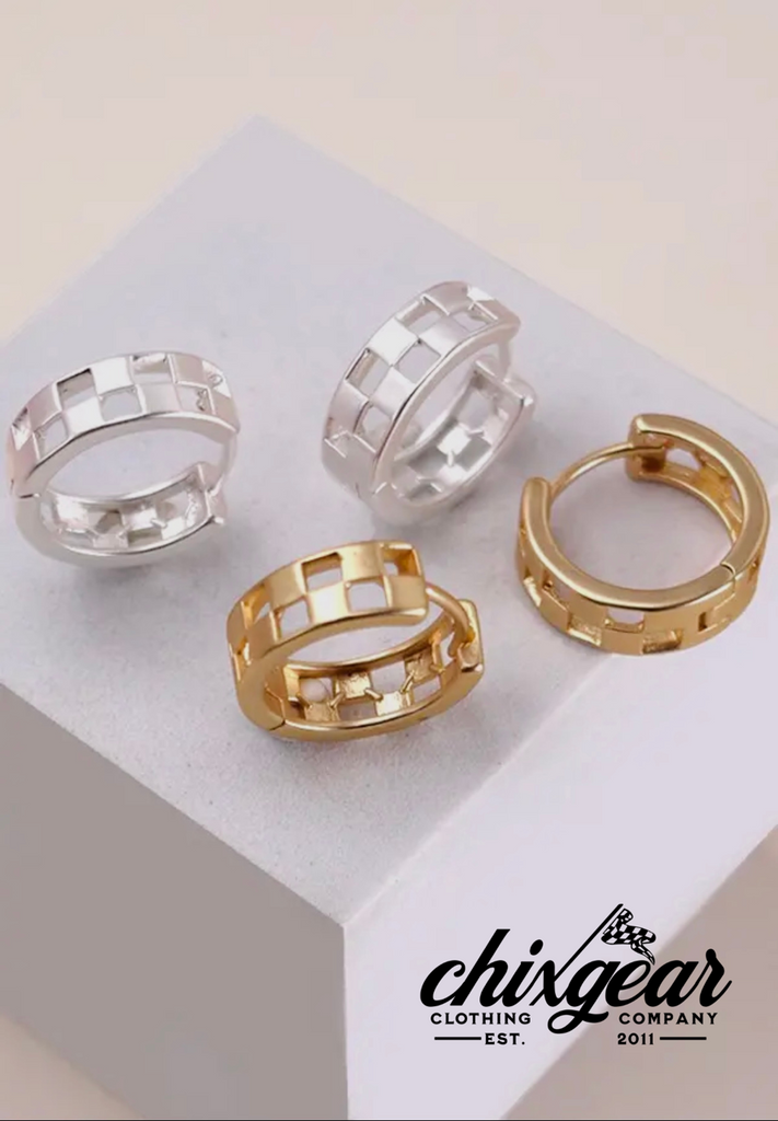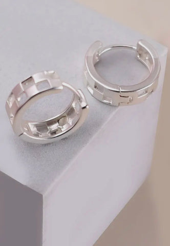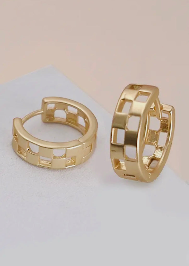 Mini cutout checker hoop huggie earrings. The huggie style suggests a snug fit to the earlobe. This type of earring is likely to be a stylish and modern accessory, providing a balance between classic hoop design and contemporary detailing with the cutout checker pattern.