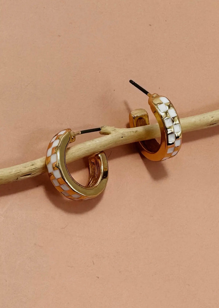 Mini Checker Hoop Huggie Earrings, featuring a stylish checker pattern that adds a touch of sophistication to any outfit. These earrings are designed for everyday elegance, combining a classic hoop shape with a modern twist. The titanium posts ensure durability and hypoallergenic wear, making them suitable for sensitive ears.