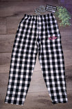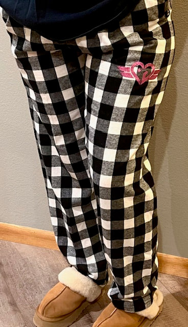 Small glitter hot pink Chix Gear logo on the left hip. Black and White checkered design. Pockets and drawstring waistband.  Has a button fly so they are UNISEX fit.  They run a bit large, but that makes them extra cozy.